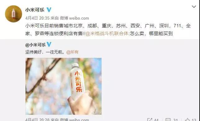 最近两天出现一个叫做小米可乐的可乐饮料品牌,通过新浪微博社交平台,现在就可以查询到这个品牌的官方微博叫做小米可乐。也就是说,现在小米可乐这个品牌不仅已经成功完成了注册,而且还已经推出了产品,更有甚者,还已经在微博上进行推广营销。如下图所示,就是小米可乐这个。品牌的官方微博,在微博中发布的第一条动态。动态内容是坚持美好,一往无前,并且小米可乐透露,目前销售的城市在北京,成都,重庆,苏州,西安,广州,深圳。还有711全家,罗森等连锁便利店。