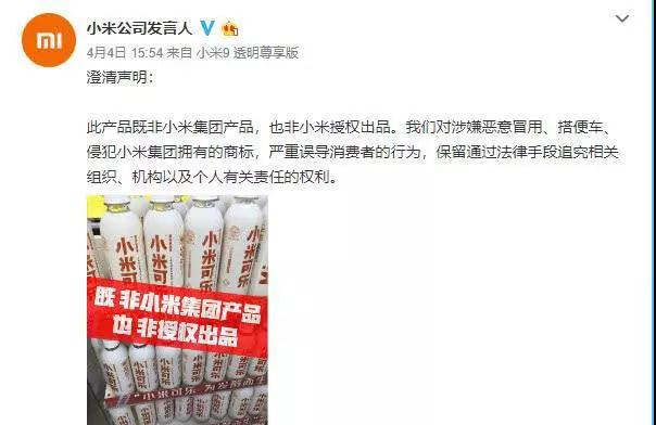 对于这横空冒出来的一个小米可乐品牌,这种堂而皇之的碰瓷行为,让小米公司显得非常手足无措。2019年4月4日小米公司发言人官方微博在新浪微博发布动态澄清,对于小米可乐这个品牌不是小米集团的产品,也并非小米授权出品,小米对于涉嫌恶意冒用搭便车侵犯小米集团拥有商标,严重误导消费者的行为,保留通过法律手段追究相关组织机构以及个人的有关责任权利。