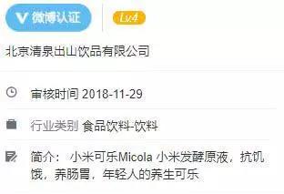 通过查询小米可乐这个微博的注册信息可以看出,这个微博账号隶属于北京清泉出山饮品有限公司,注册时间是2018年11月29日,类别属于食品饮料类,简介是小米可乐小米发酵原液,抗饥饿肠胃年轻人的养生可乐。随着现在更多的年轻人开始注重保养自己的身体,这款叫做小米可乐的饮料,产品显然是看准了年轻人养生这个市场。