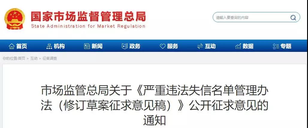 市场监管总局关于《严重违法失信名单管理办法(修订草案征求意见稿)》公开征求意见的通知